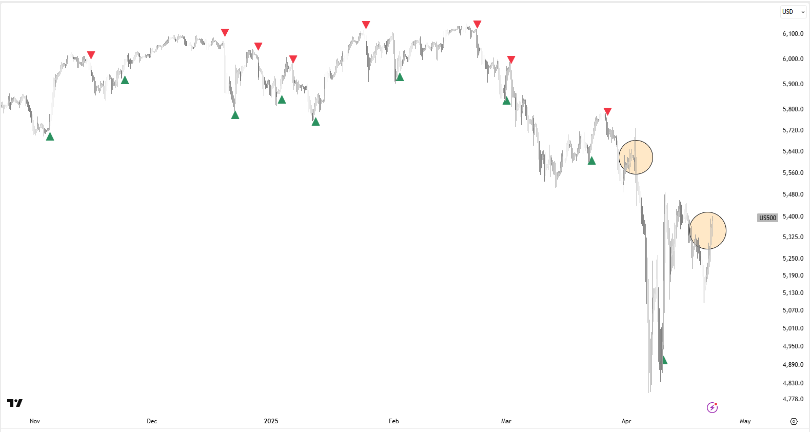 below is S&P500. area marked in circle is when Trump began his tariff tantrum. second one is yesterday