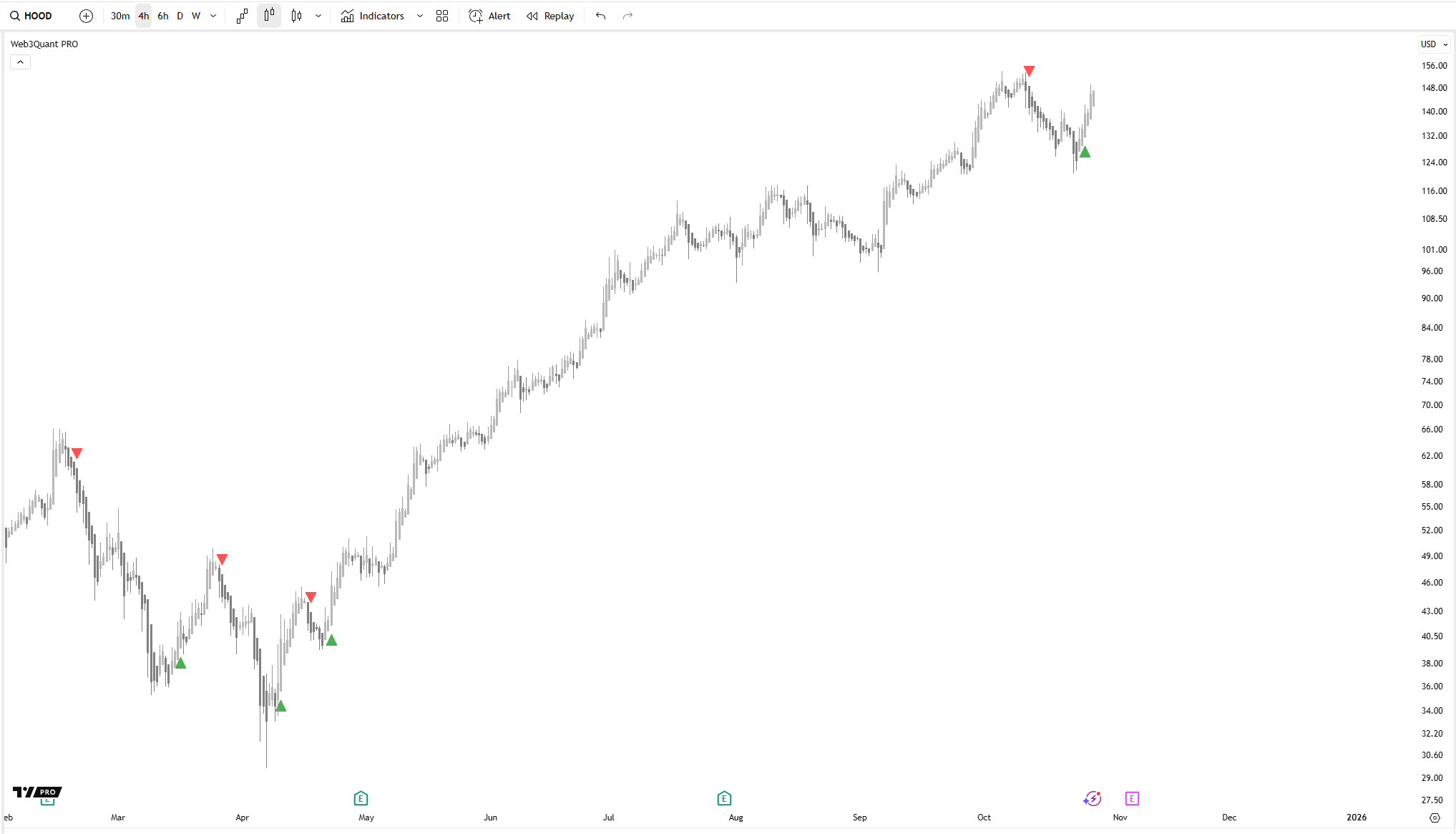 system caught the entire upmove of HOOD from 30s to 140s.