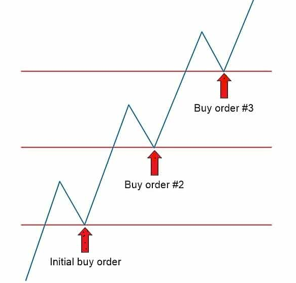 - Adding to a position in fixed increments at a predetermined price or time intervals.