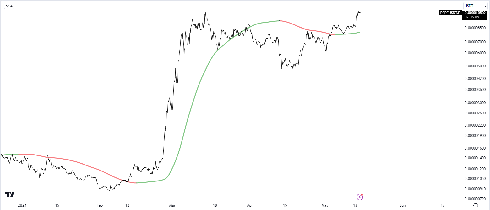 from a momentum perspective, PEPE looks the strongest of the pack.