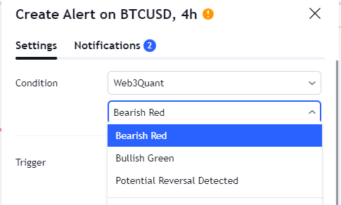 Now you can add alerts to all 3 conditions. When the indicator turns Bullish(Green) / Bearish (red) / Potential Reversals (Black)